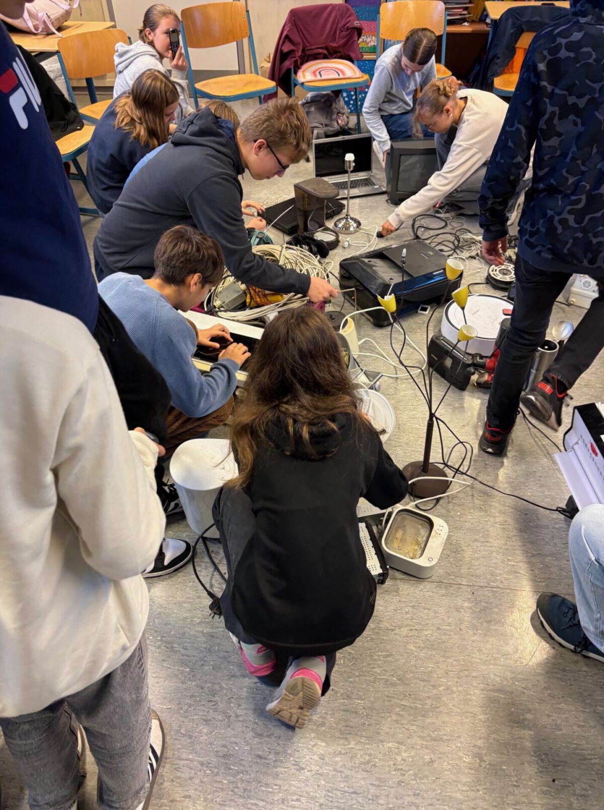 Gesammelt wird mit großem Einsatz: vor Unterrichtsbeginn, in den großen Pausen und auch im Unterricht. Direkt vor dem Klassenraum der 7d ist eine Sammelstelle eingerichtet, an der Geräte entgegengenommen, sortiert und für den Abtransport vorbereitet werden. Ob Toaster, Kabel, Tastatur, Lichterkette oder DVD-Player – alles kann bis zum 14. Oktober in der Schule abgegeben werden.