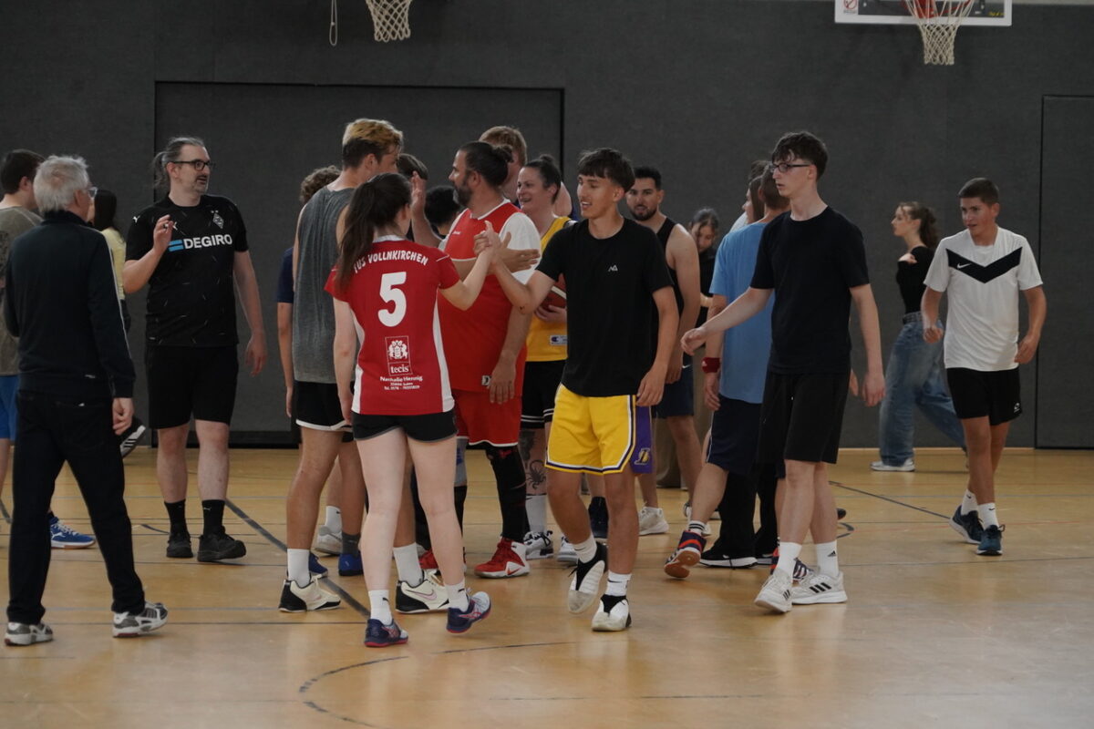 Spieler und Spielerinnen begrüßen sich