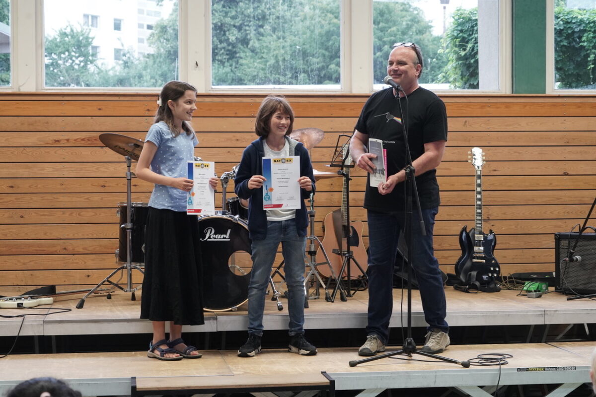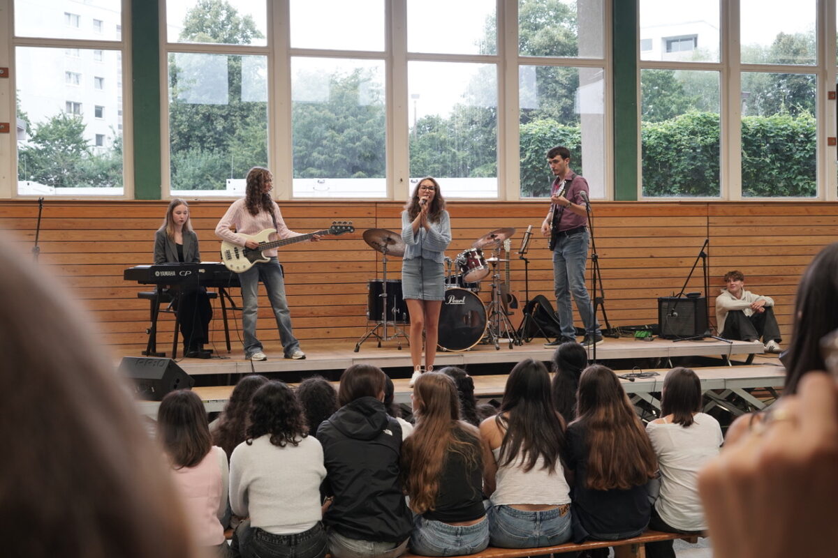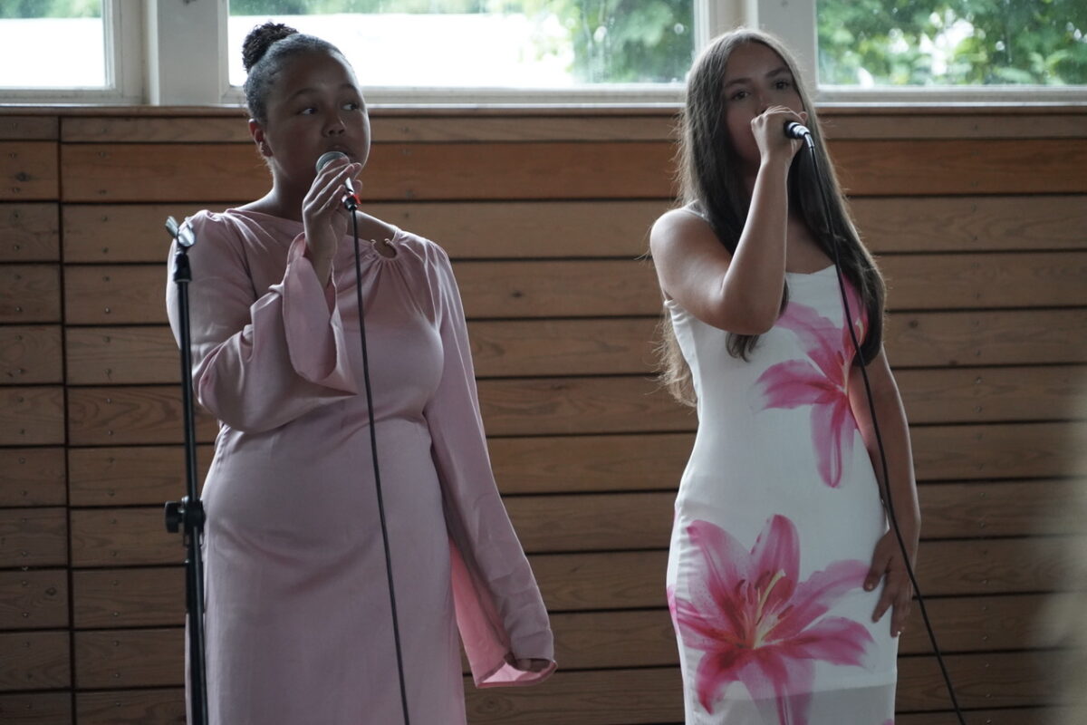 Die beiden Sängerinnen der Band 7c bei der Eröffnungsveranstaltung in der Sporthalle