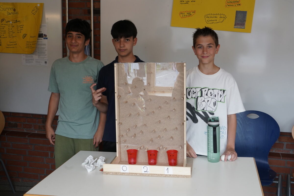 Drei Sechstklässler mit ihrem selbstgebauten Glücksspiel